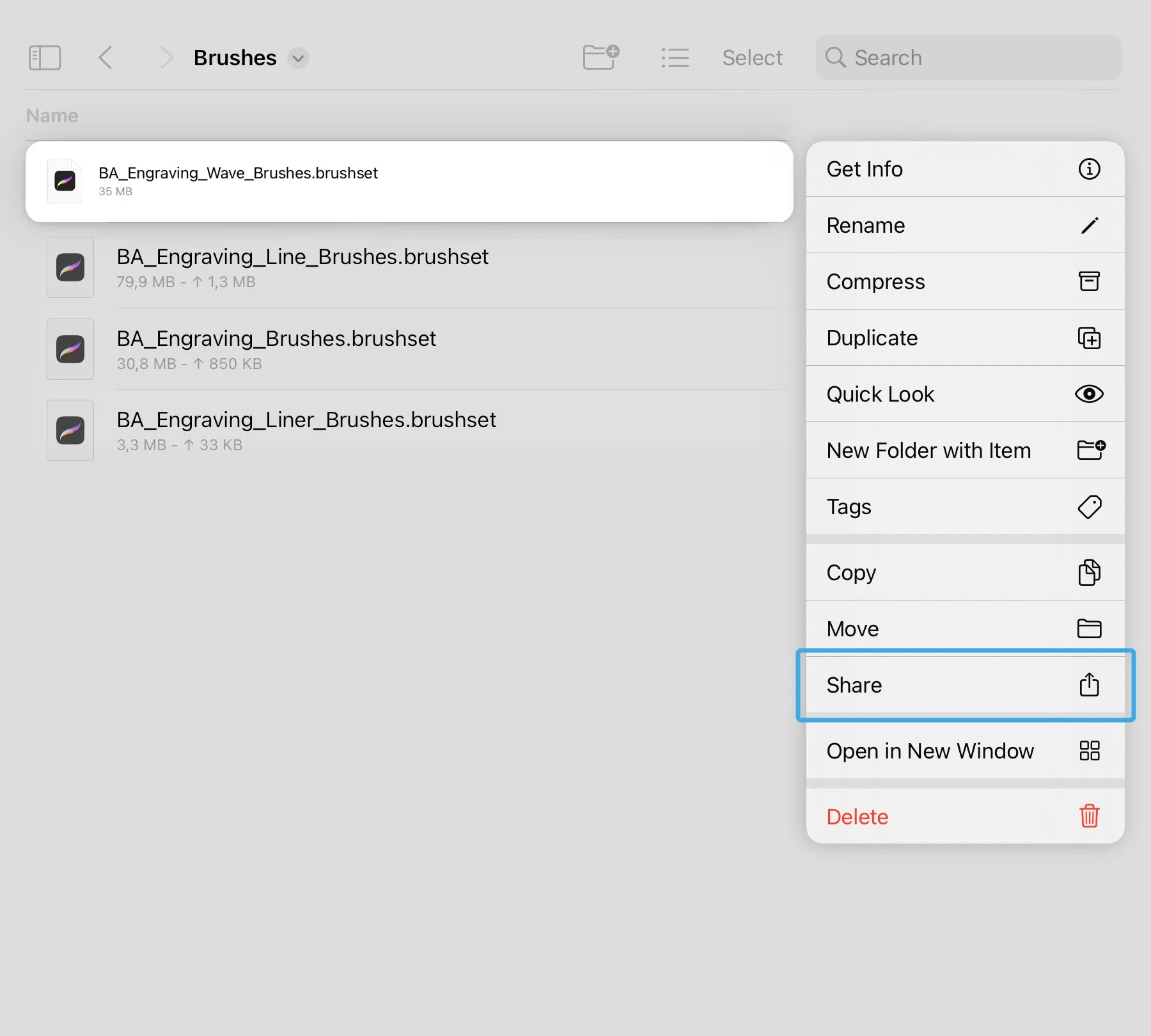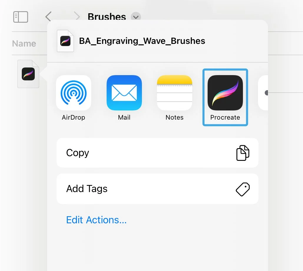 Select the Import Brushes option on the Menu and browse files on your device: