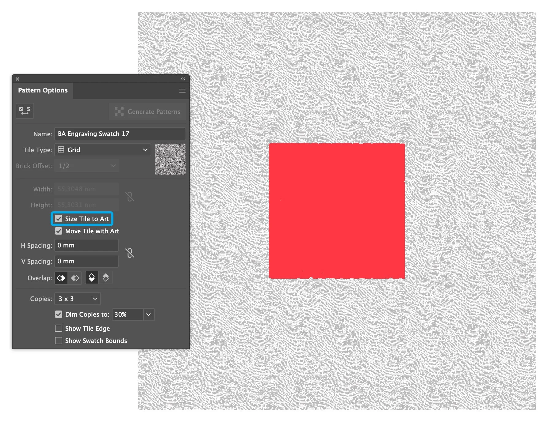 In the Pattern Options panel, ensure the Size Tile to Art box is checked. Next, select the pattern elements directly on your artboard.