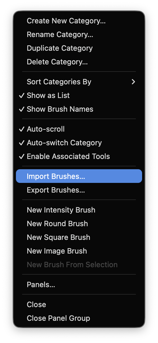 Click the panel menu (˅) and choose Import Brushes…